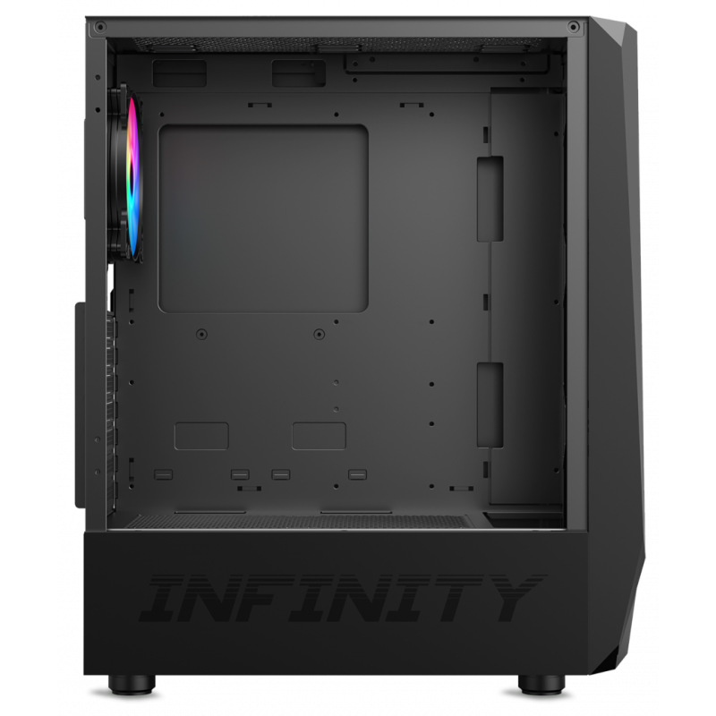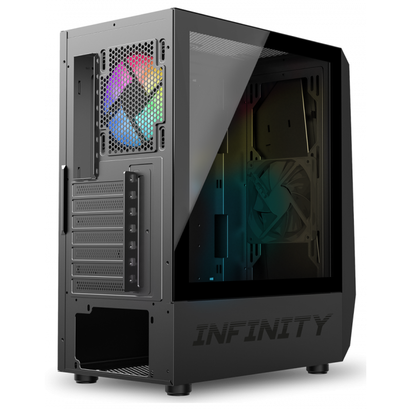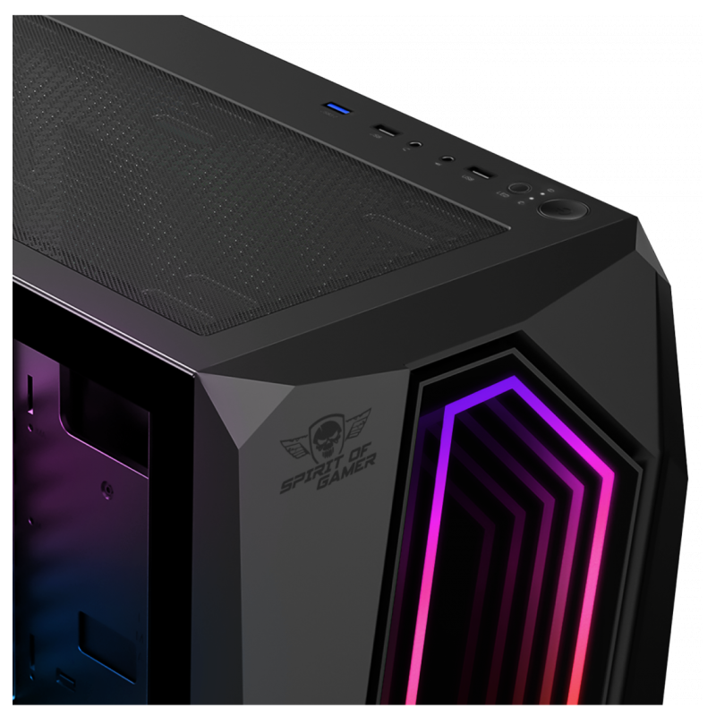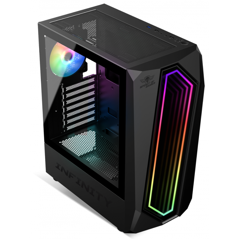 Boîtier Gamer Moyen tour Spirit OF Gamer INFINITY DARK – Format d’alimentation: ATX / EPS – Format de carte mère: ATX / Micro ATX / Mini ITX – Hauteur ventilateur CPU max: 165 mm – Longueur carte graphique max: 315 mm – Nombre de slots PCI: 7 – Contrôleur RGB – HD Audio : 1x Jack 3.5 mm Audio /1 x Jack 3.5 mm Micro – 1x USB 3.0 – 2x USB 2.0 – 2x HDD 3.5″ – 2x SSD 2.5” – RGB Adressable: Compatible Asus Aura Sync – Ventilateurs préinstallés: Arrière 1x 120 mm ARGB, Façade 1x 120 mm – Emplacements ventilateurs: (Compartiment PSU: 2x 120 mm, Dessus: 2x 120 mm / 2 x 140 mm, Façade: 2x 120 mm / 2x 140 mm) – Radiateurs supportés: (Arrière: 120 mm, Dessus: 120 / 240 mm, Façade: 120 / 140 / 240 / 280 mm) – Filtres anti-poussière – Matériaux : Acrylique / Acier / ABS (Plastique) – Poids: 5.3 Kg – Couleur Noir – Garantie 1 an
