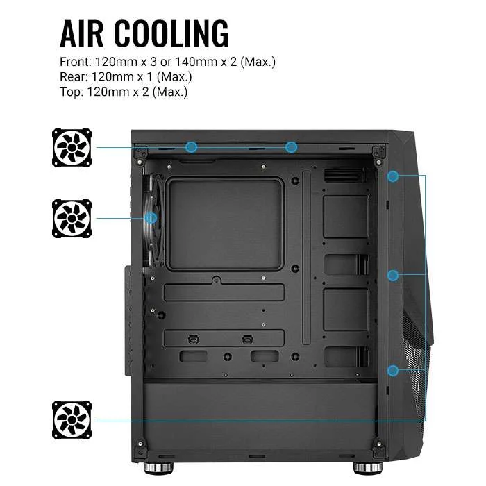 Boitier Zauron FRGB-G-BK-v2 – Format du boitier : Moyen Tour – Supporte les cartes : ATX/micro ATX/mini-ITX – Baies de lecteur 3,5″ 2 Max, Baies de lecteur 2,5″ 4 Max – 7 emplacements d’extension – Prend en charge les GPU jusqu’à 325 mm (sans ventilateur frontal) – Prise en charge d’un refroidisseur de CPU jusqu’à 166 mm – Refroidissement par air Avant : 120 mm x 3 ou 140 mm x 2 (max) – Dessus : 120 mm x 2 (max), Arrière : 120 mm x 1 (max) – Ports : 2x USB3.0, HD Audio & Mic – Dimensions du boîtier (interne) : 208 x 430 x 330 mm – Garantie 1 an