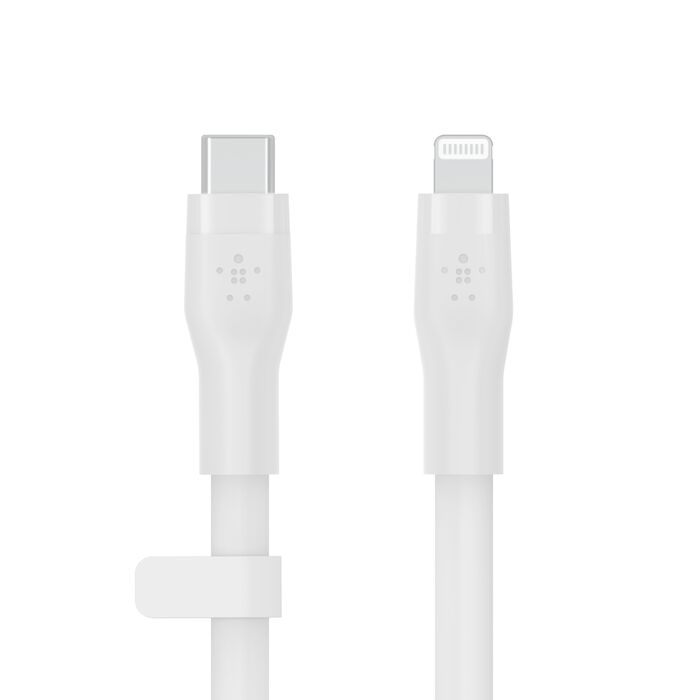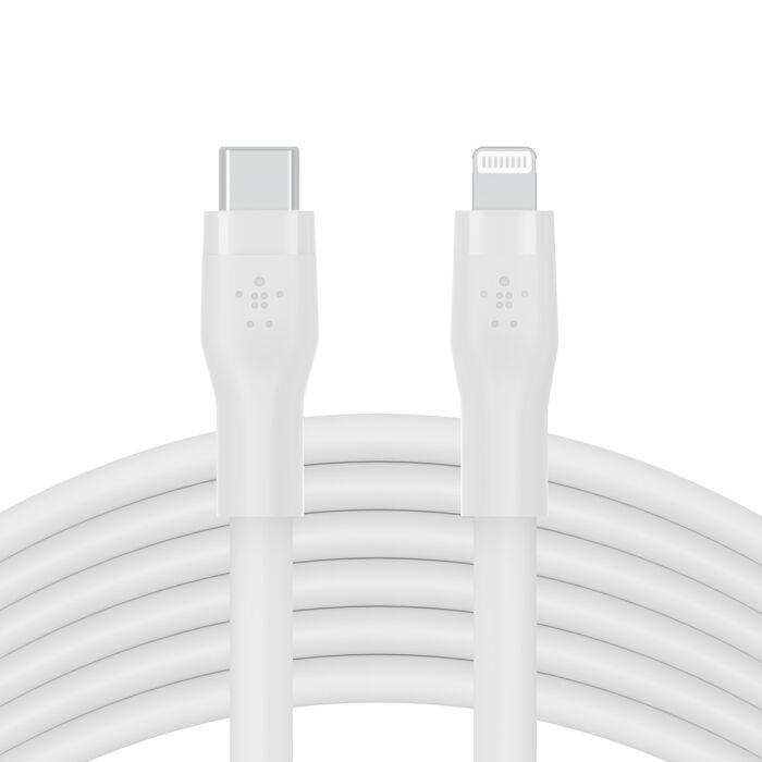 Câble Boost Charge Type-C Flex avec connecteur Lightning – Longueur de câble: 3 m – Connecteur : USB C (Mâle), USB C/Lightning (Mâle) – fonctionnalité de charge pratique et durable – Matériau de la prise du câble : Silicone – Câble certifié MFi – Couleur Blanc