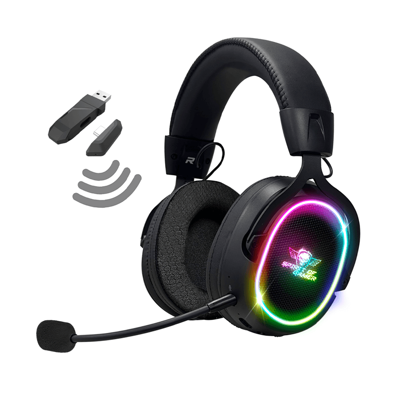 Casque Micro Gaming Sans Fil Spirit of Gamer XPERT H1200 – RGB, Norme Audio: Stéréo/Windows Sonic, Surround 7.1 Virtuel, Connectique: Câble Jack 3, Type de casque: Circum-aural, Type de micro: Amovible, Flexible, Omnidirectionnel, Réduction de bruit, Connexion: Triple modes, Diamètre Haut-Parleurs: 50 mm, Sensibilité casque: 103 dB (+/-3dB), Fréquence casque: 20~20 KHz, Impédance casque: 20 Ohms, Sensibilité microphone: -38 dB (+/-3dB), Impédance microphone: 2, Batterie: Autonomie 8-10 heures, Rechargeable 1000 mAh, Compatibilité: Consoles, PC, Nintendo, Matériaux: Bandeau, Base arceau, Coussinets HP, Couleur: Noir, Poids: 385 g