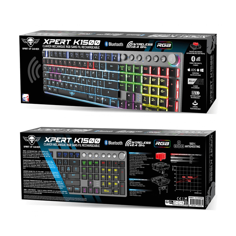 Clavier Gamer Mécanique Sans Fil Spirit of Gamer, RGB personnalisable (20 modes), 100% Anti-Ghosting, Switches Red Low Profile, temps de réponse ultra-rapide, Châssis Aluminium, 3 touches Master, Rechargeable 2200mAh, Autonomie: 12h avec RGB – 60h sans RGB, Connectivité: Bluetooth / USB, Poids: 630gr