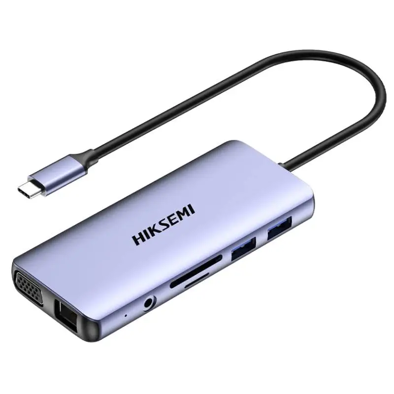 HUB USB Hiksemi Multifonctionnel Type‑C 11 en 1 DS11 – Interface de sortie : Audio 3,5 mm + Lecteur TF + Lecteur SD + 2 ports USB 3.0 + 2 ports USB 2.0 + HDMI + USB‑C PD + RJ45 + VGA – Port RJ45 supportant un débit de transmission jusqu’à 1000 Mbps & fonction réseau filaire – Compatible avec plusieurs appareils tels que ordinateur portable, tablette, téléphone, Nintendo Switch, imprimante, souris, clavier, etc. – Systèmes pris en charge : Windows / macOS / Linux / Android / iPadOS – Matériau du produit : alliage d’aluminium – Dimensions du produit : 119,2 x 51,4 x 14 mm – Couleur du produit : Gris – Garantie 1 an
