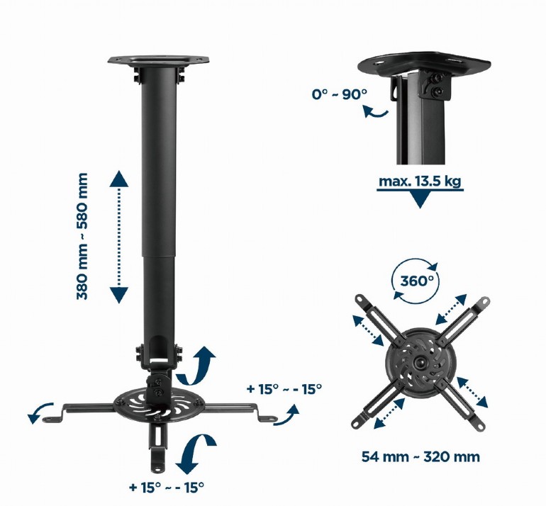 Kit de Fixation Plafond pour Vidéo Projecteur – matériau en alliage d’aluminium – Rotation complète à 360 ° – Montage projecteur plafond réglable – Prend en charge la plupart des projecteurs/faisceaux : max. 13 kg