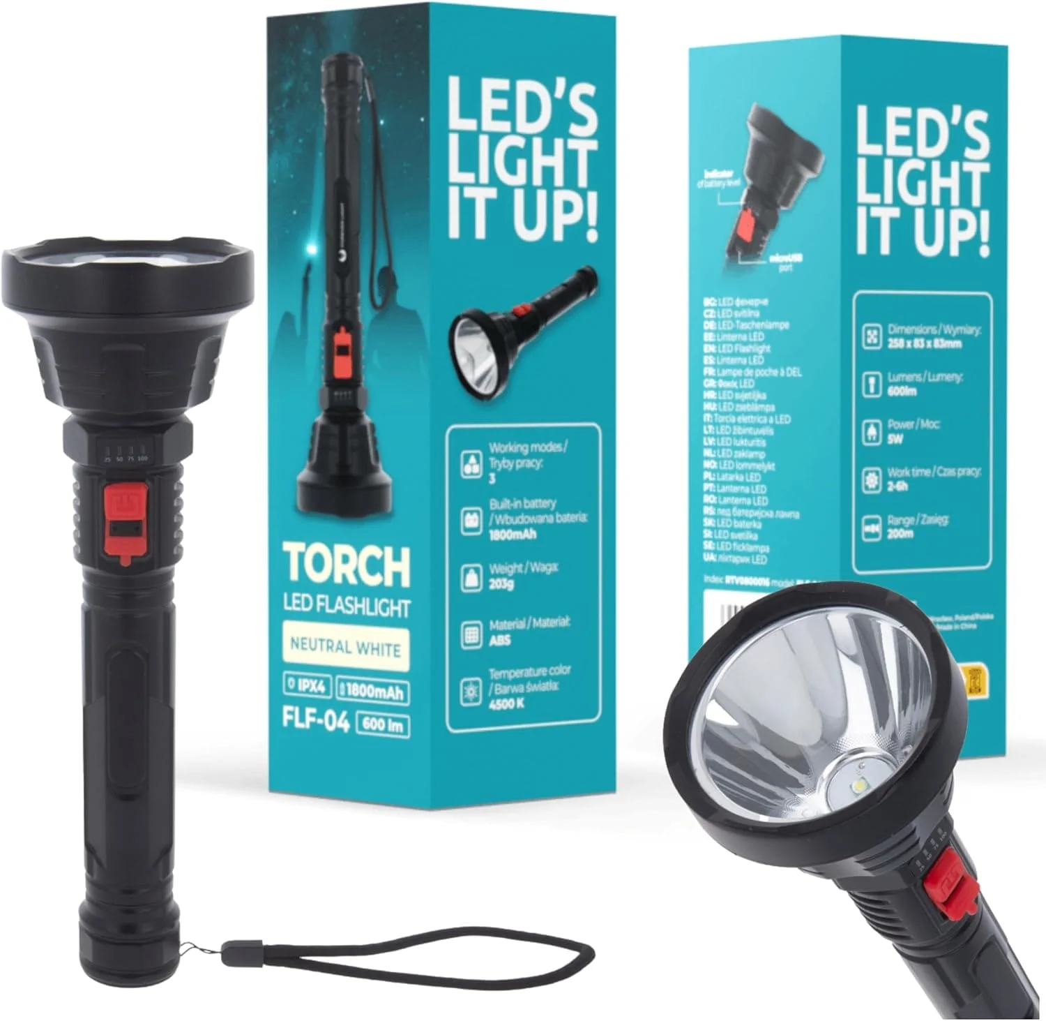 image de foreverlight_logo_poziomLampe torche LED Forever Light – Nombre de lumens : 600 lm – Capacité de la batterie : 1 800 mAh – Durée maximale de travail : 3h – Temps de charge : 4h – Indice de protection : IP44 – Poids net : 203 g – Couleur : Noir