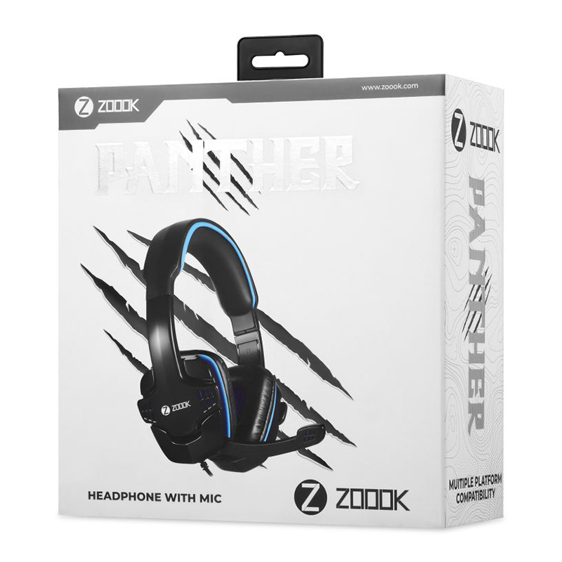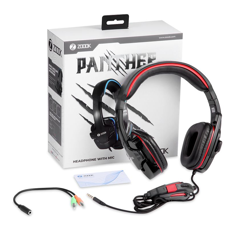 Casque Micro ZOOOK Panther, connectique: Filaire Jack 3.5mm, Longueur du câble: 1.8 m, Son: stéréo puissant et équilibré, coussinets en cuir souple, Haut-parleur: Φ40 mm, Impédance: 32 Ω, Sensibilité: 108 dB ± 3 dB, Fréquence: 20 Hz – 20 kHz, Microphone: Φ6,0 x 5,0 mm.Disponible sur commande