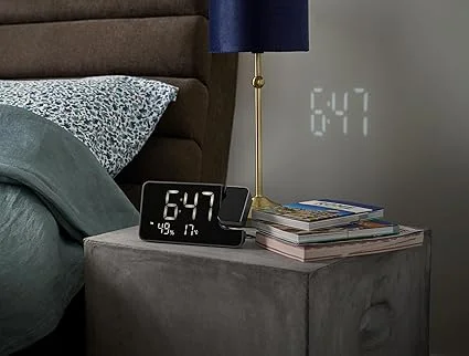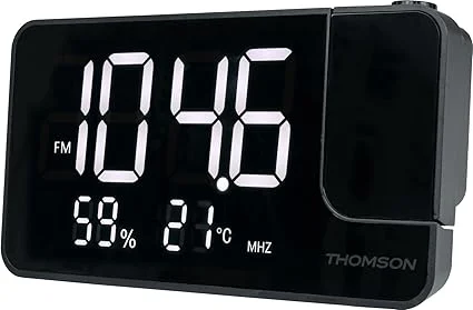 Radio-Réveil avec projection CP100T THOMSON – Radio FM avec autoscan – Double alarme avec fonction snooze – 20 stations mémorisables – Projection de l’heure ajustable – Affichage de l’heure, de la température intérieure et du taux d’humidité de la pièce – 12h/24 heures – Minuterie 5 à 90 min – 3 Réglages de l’intensité lumineuse de l’écran 0 à 100% – Chargeur USB-C (5V – 1A) – Sauvegarde de l’heure (Pile CR2032) – Adaptateur secteur inclus – 5V 1.5A 7.5W – Poids : 0.24 kg – Couleur : Noir