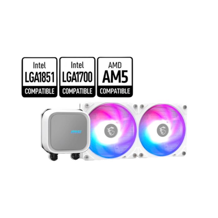 msiRefroidisseur De Processeur Gamer MSI MAG CORELIQUIDE I240 – Compatibilité: INTEL: LGA 1700/1851 ; AMD: AM5 / AM4 – Vitesse de la pompe: 3800 tr/min ± 10 % – Niveau sonore de la pompe: 20 dBA (moyenne) – Courant nominal de la pompe : 0,24A – Consommation électrique de la pompe: 2,88W – Connecteurs de pompe: Connecteur 3 broches 5 V ARGB Connecteur 3 broches (femelle) – Taille du radiateur: 240 millimètres – Dimensions du radiateur: 277 x 119,6 x 27 mm – Matériau du radiateur: Aluminium – 2 x Ventilateurs – Roulement de ventilateur: Roulement de fusil – Dimensions du ventilateur: 120 x 120 x 25 mm – Débit d’air du ventilateur: 62,6 pi3/min – Courant nominal du ventilateur: 0,15 A (max. : 0,18 A) – Consommation électrique: 1,8 W (maximum : 2,16 W) – Connecteurs de ventilateur: Connecteur 5 V ARGB 3 broches  Longueur du câble: 450 mm – Éclairage du ventilateur: ARVB Gen2 – Couleur: Blanc – Garantie: 1 an