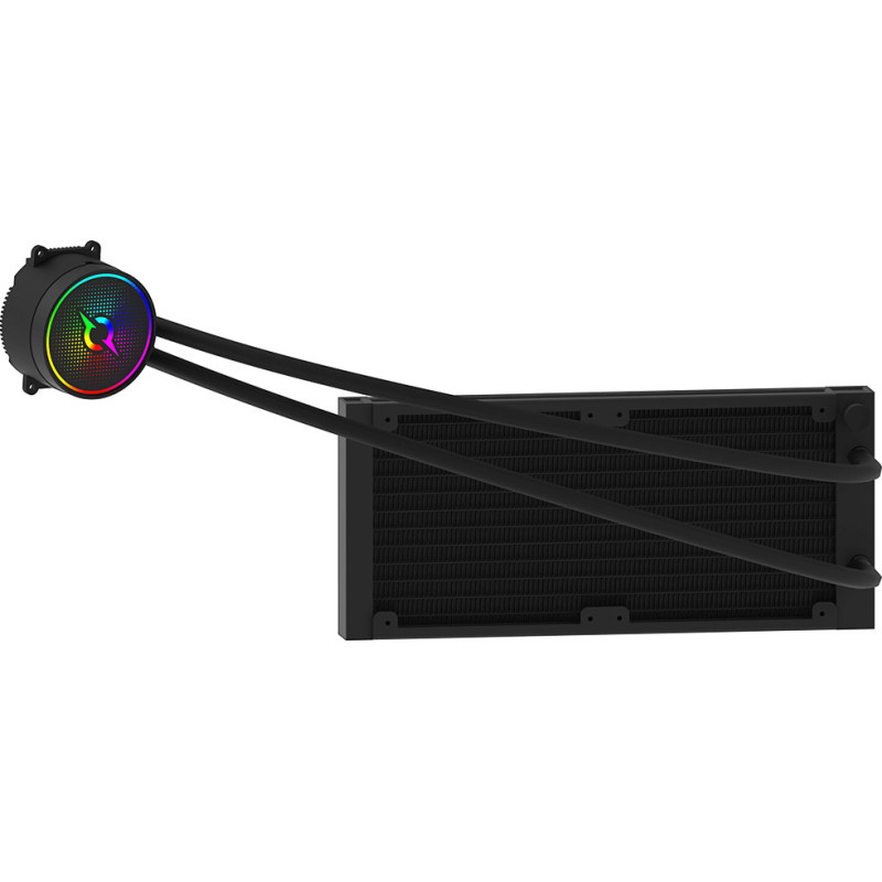 * Type de tube : Caoutchouc à très faible évaporation, nylon tressé * Dimensions du ventilateur : 120 x 120 x 25 mm * Roulement de ventilateur : Hydraulique * Vitesse du ventilateur: 800 – 2400 ± 10% tr/min * Débit d’air du ventilateur : 30 – 85 PCM * Tension nominale du ventilateur : DC12V * Connecteurs de ventilateur : 4 broches (PWM) + ARGB 3 broches * Ventilateur inclus : 2 pièces * Caractéristiques spéciales : Contrôleur ARGB inclus ; Pâte thermique haute performance incluse * Éclairage: ARGB (pompe et ventilateur) * Compatibilité ARGB : ASRock Polychrome SYNC, ASUS Aura Sync, GIGABYTE RGB Fusion, MSI Mystic Light Sync * Contrôlé par PWM : Oui (pompe et ventilateurs) * Couleur: Noir |