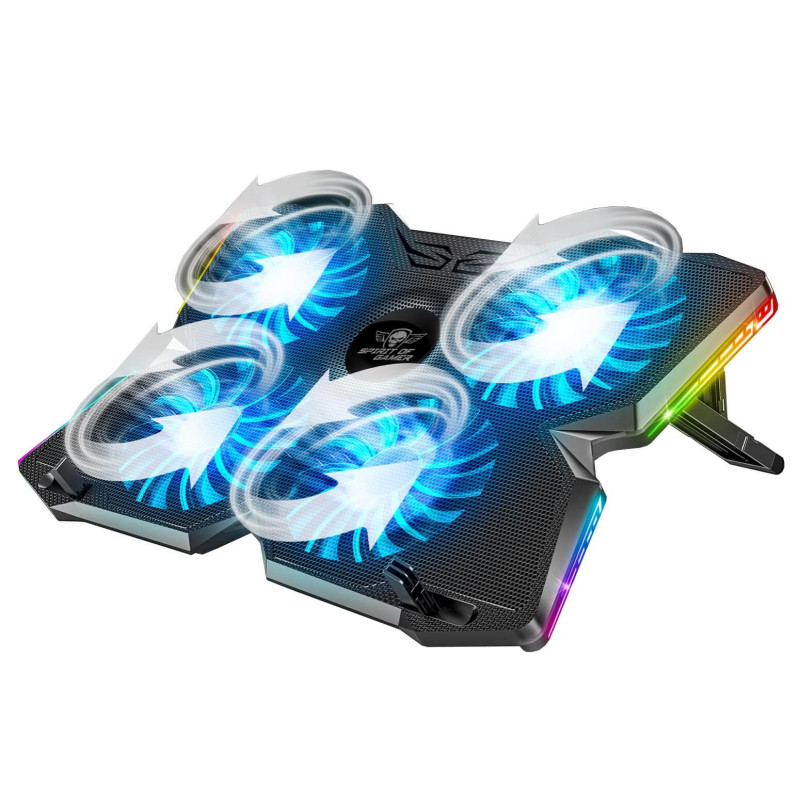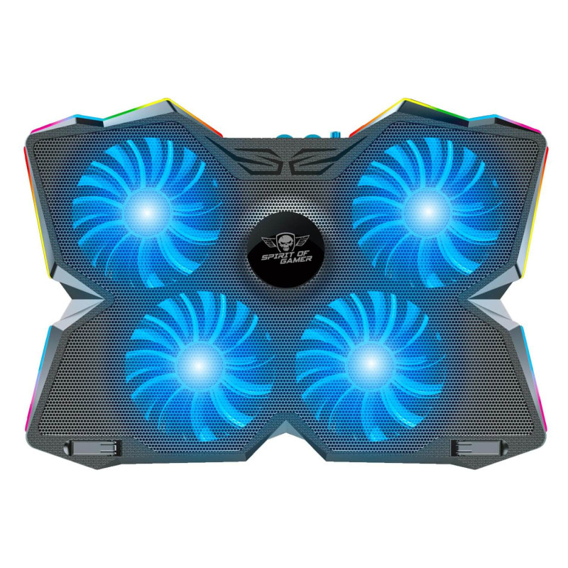 Refroidisseur SPIRIT OF GAMER Airblade 500 Pour PC Portable 17 – 4 ventilateurs de 120 mm avec fonctionnement silencieux – Plateau orientable avec angle de 10° à 30° sur 7 positions – Vitesse de rotation maxi: 900 RPM – Rétroéclairage bleu au niveau des ventilateurs + rétroéclairage RGB – Débit d’air maxi: 75 CFM – Matériaux: Plastique – Niveau sonore: 25 dBA – Plateau avec dispositif anti-chute – Dimensions: 405 x 285 x 30 mm – Poids: 730 gr – Couleur: Noir – Garantie: 1 an