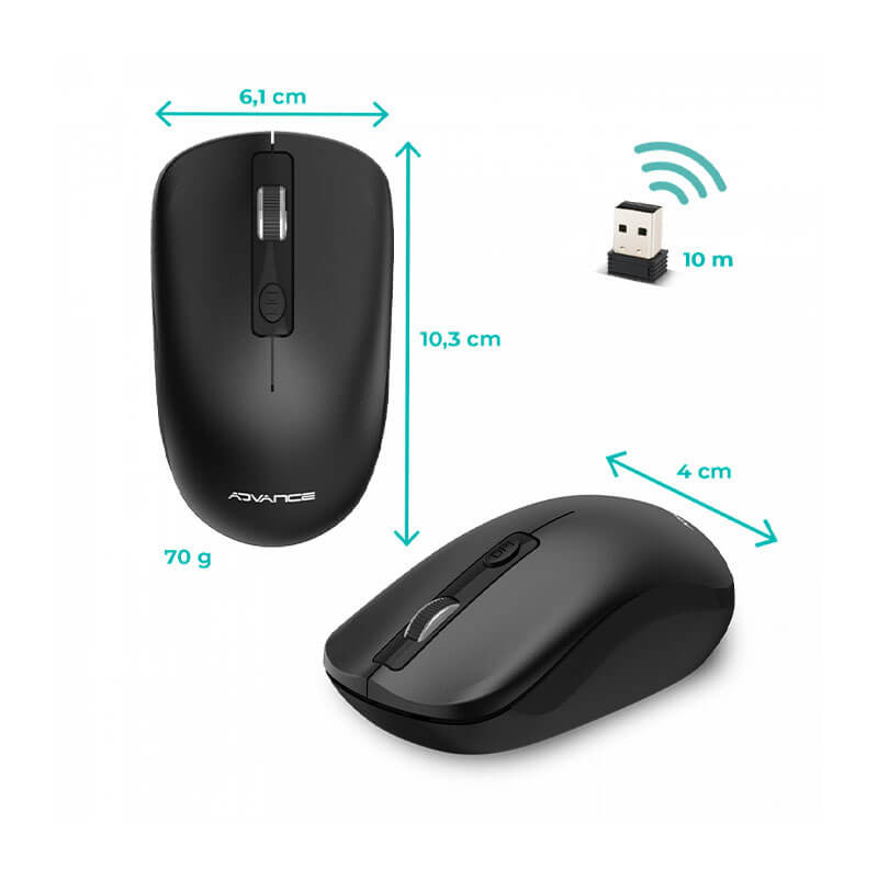 image de logo advanceSouris sans Fil Advance SWIFT 4D – Résolution : 1600 dpi – 4 boutons et une molette de défilement – Ergonomie Ambidextre – connexion sans fil fiable grâce à la technologie 2.4GHz – Distance de fonctionnement : 8-10 mètres – Fonctionne avec 2 piles AAA (non incluses) – Compatible avec Windows et macOS – Dimensions : 10,3 x 6,1 x 4 cm – Poids: 55 g – Couleur : Noir – Garantie 1 an